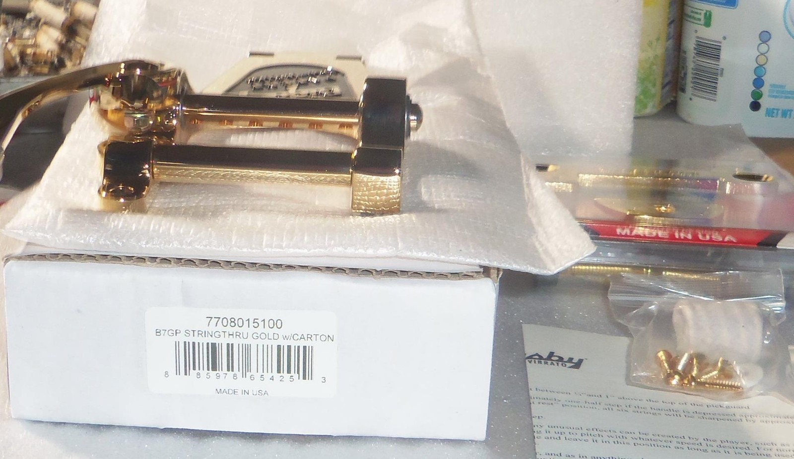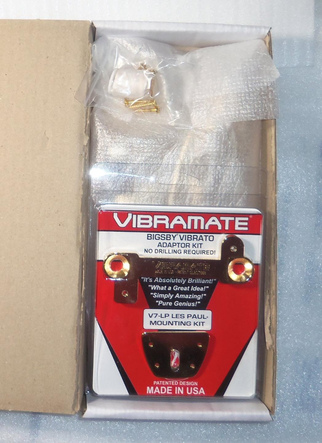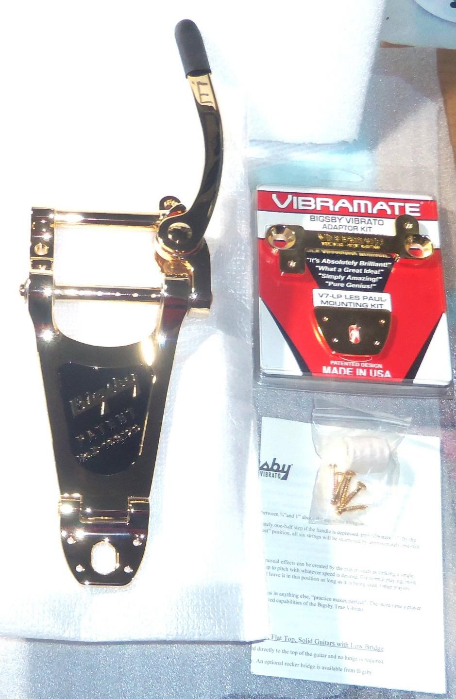 Brand New Genuine Bigsby B7G Pinless,String Through Gold Vibrato Tailpiece & Gold Vibramate V7-LP-G.For arch top solid and semi hollow body guitars.The Bigsby B7G has a Gold finish,sand cast body & includes gold arm,mounting screws and spring.The Vibramate V7 Mounting Kit adapts a Bigsby B7 to fit a Gibson Les Paul and other archtop guitars with Tune-O-Matic bridges without permanent modification.It also includes gold mounting hardware.Both items will ship factory packaged.Made in the USA.