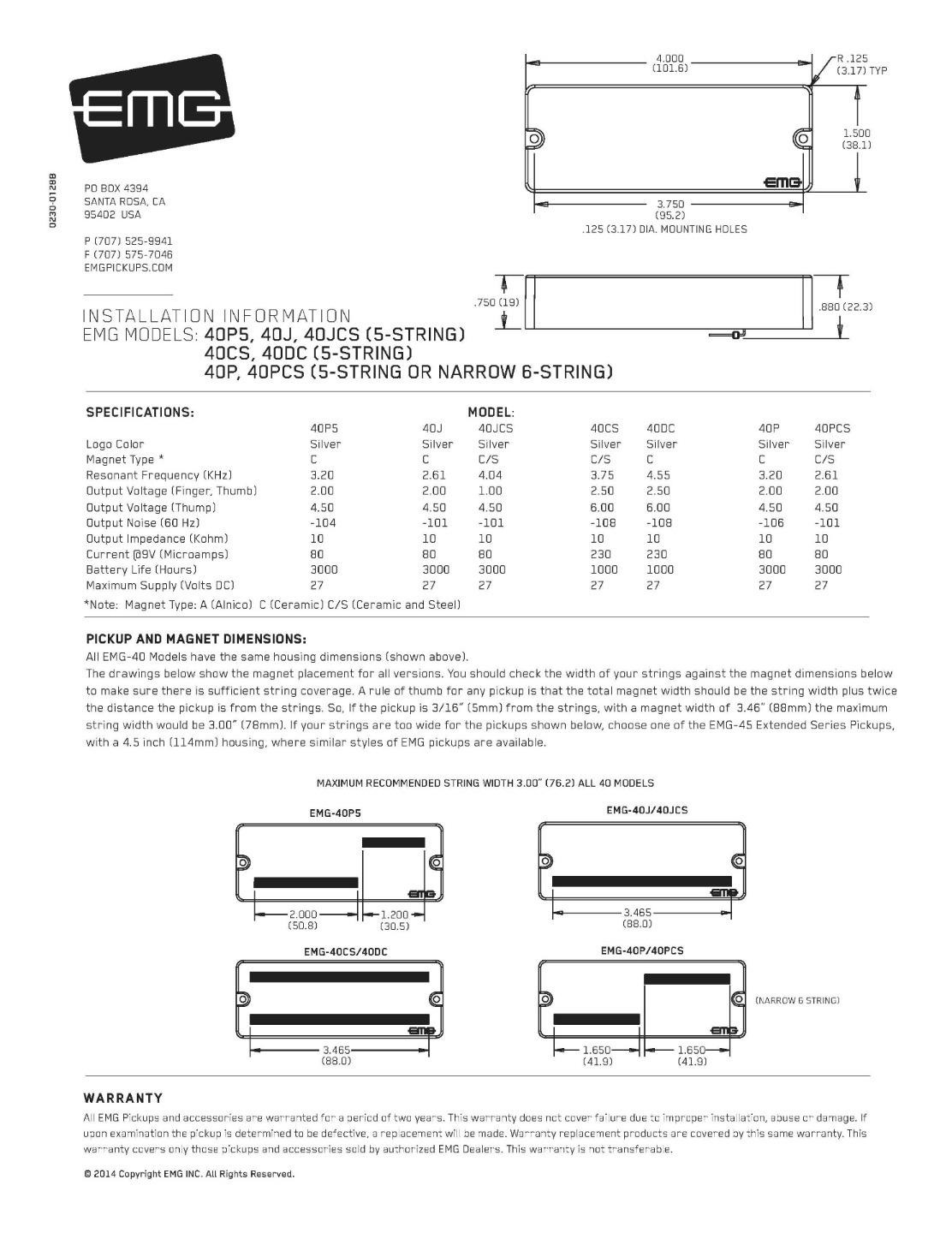 The EMG 40DC is a powerful modern sounding humbucker for bass players looking to cut through a big loud mix. The two coils loaded with ceramic bar magnets provide punch and clarity with a crisp top end and plenty of output. This extremely versatile pickup gives players a sonic range that covers the cleanest highs right down to the dirtiest, growling lows. This model uses an extended housing that is 4 inches (102mm), perfect for five string basses. The included solderless wiring makes installing this pickup easy to do at home. Make sure to check the instructions for pickup measurements before purchasing to compare your existing pickups with EMG models.