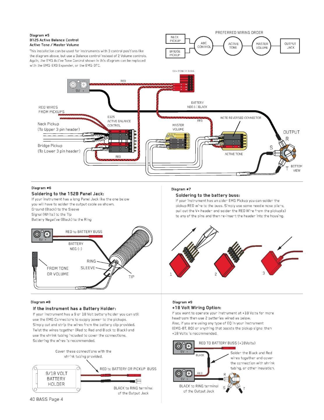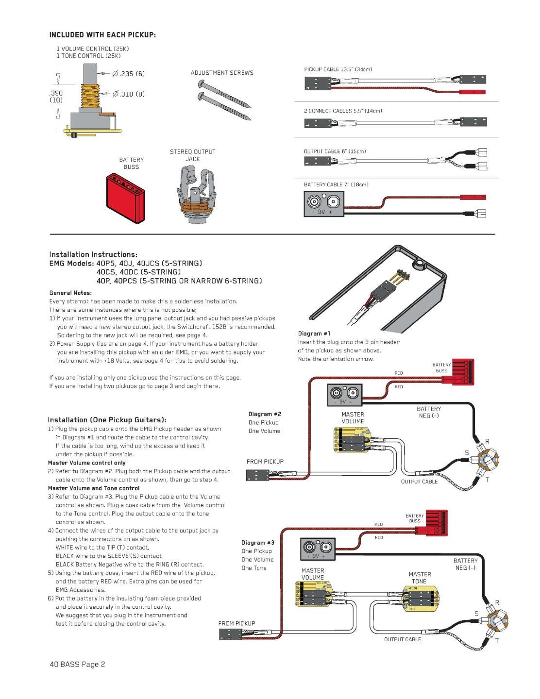 Brand New EMG 40DC Active Red 5 String Bass Humbucker Pickup. Made In The USA.From EMG: Package Includes EMG’s exclusive Solderless Install System: 1 25k volume pot 1 25k tone pot 1 battery bus 1 stereo output jack 1 pair mounting screws 1 pickup cable 2 connect cables 1 output cable 1 battery cable