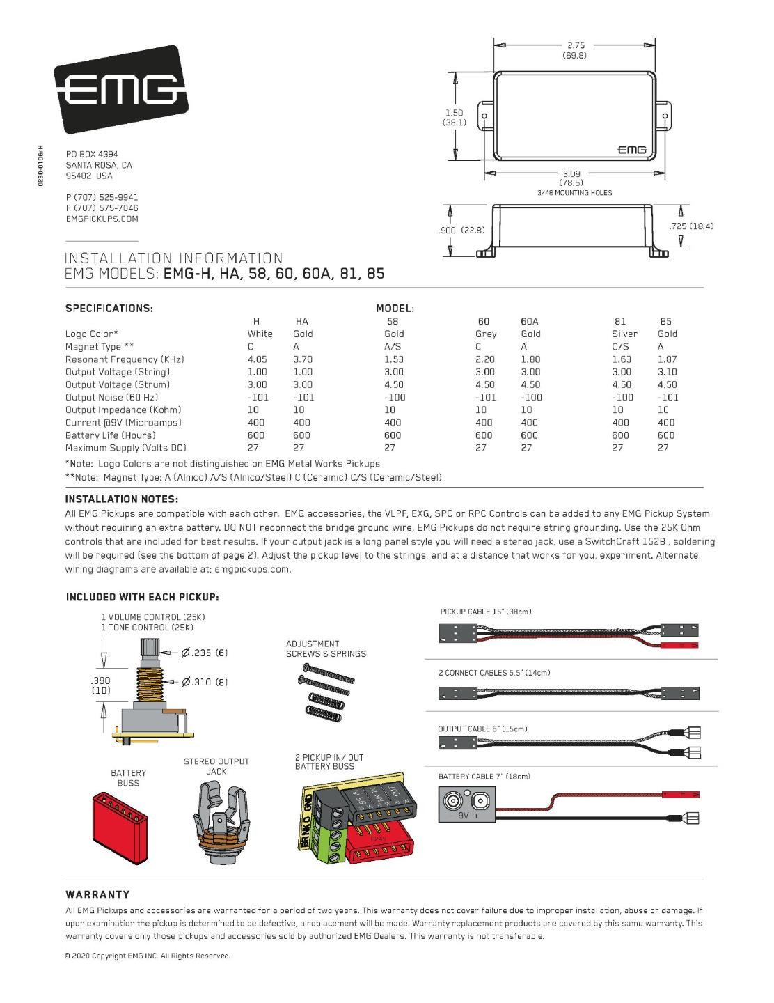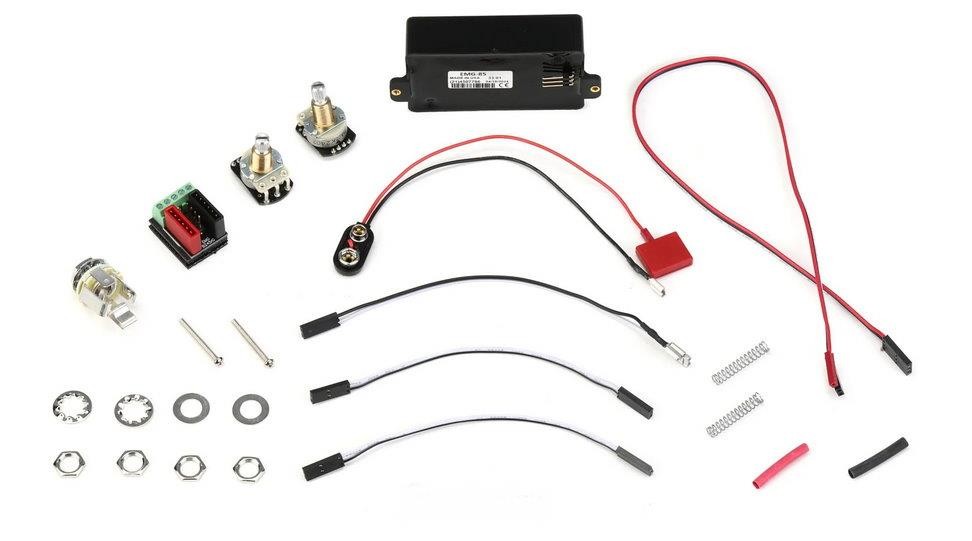 Brand New EMG 85 Active Black Humbucker Pickup.Made In The USA.From EMG: Package Includes EMG’s exclusive Solderless Install System: 1 25k volume pot 1 25k tone pot 1 battery bus 1 stereo output jack 1 two pickup in/out bus 1 pair mounting screws and springs 1 pickup cable 2 connect cables 1 output cable 1 battery cable The 85 is one of EMGs first pickups and is the slightly more sophisticated and well rounded half of its famous brother, the 81. Featuring close aperture coils loaded with Alnico V magnets, the 85 is a powerful guitar pickup with exceptional tone and versatility. The Alnico magnets of this model provide a muscular growl and smooth lead tones enabling you to play everything from the blues to the most extreme metal. Although often used in the neck position, make no mistake, the EMG 85 sounds great as a bridge humbucker thanks to its exceptional smoothness and soul. This pickup pairs well with just about every other humbucker in our line and using our solderless system, it makes changing your tone easier than ever.