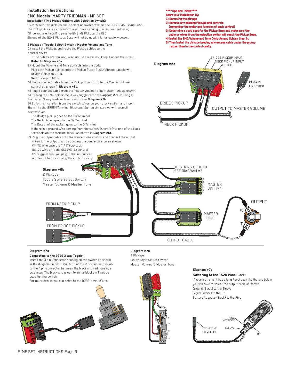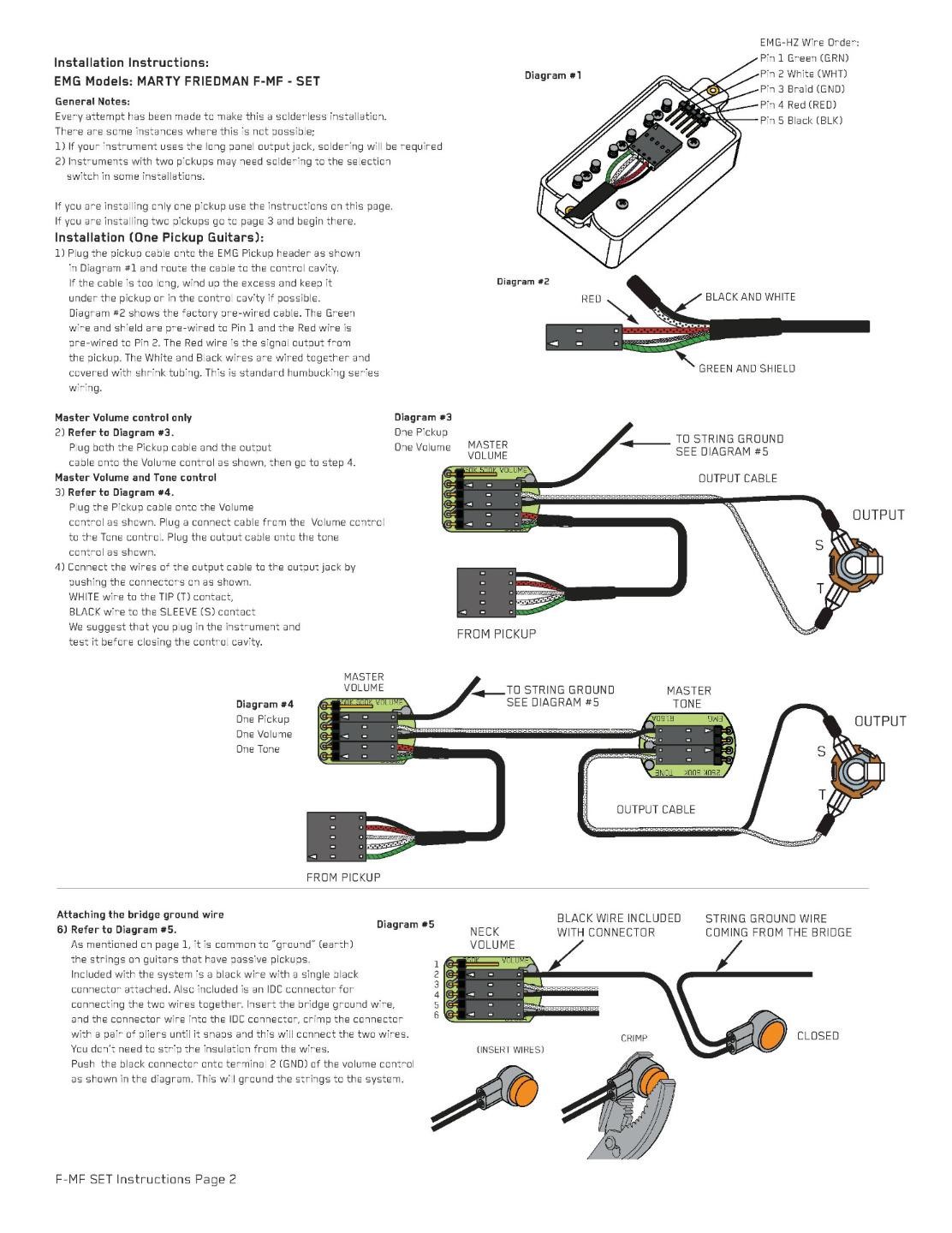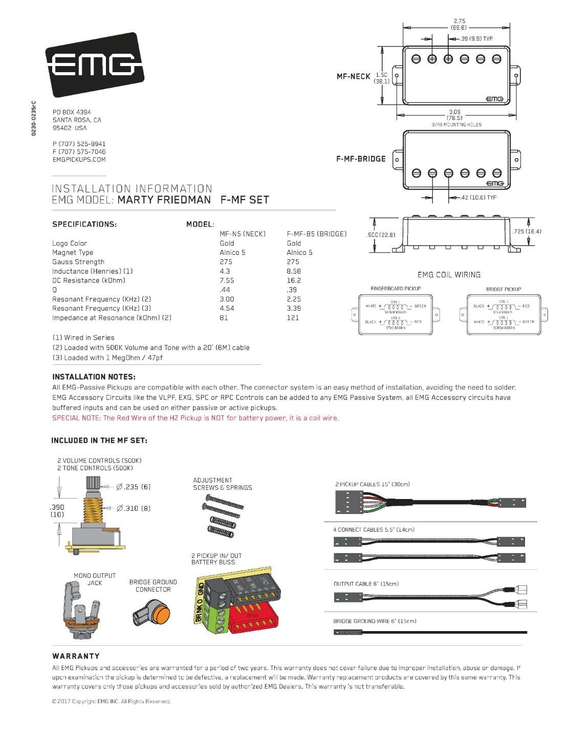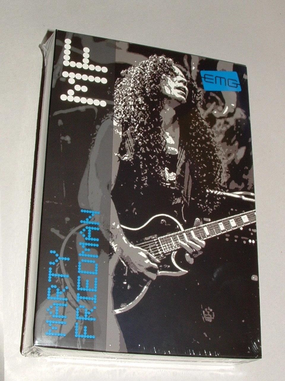 2 500k volume pot 2 500k tone pot 1 stereo output jack 1 two pickup in/out bus 2 pair mounting screws and springs 2 pickup cables 4 connect cables 1 output cable Guitar virtuoso Marty Friedman relies on only the best of everything to deliver his unique one-of-a-kind guitar mastery. EMG had been part of this equation for the former Megadeth guitarist for years. EMG president and founder Rob Turner set out to develop a brand new passive signature set for Marty that delivered all of the dynamic response, power, punch and clarity that only EMG can.With alnico 5 magnets and a brand new recipe for winding the custom made bobbins, the result was exactly what Marty had been searching for. Available in Marty’s favorite brushed black chrome finish, these pickups look as deadly as they sound. “When I heard this pickup, I knew it was “the one” because it made me want to keep playing and never stop. This is my sound. I’m glad EMG took the time to get it right.