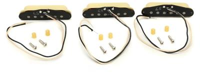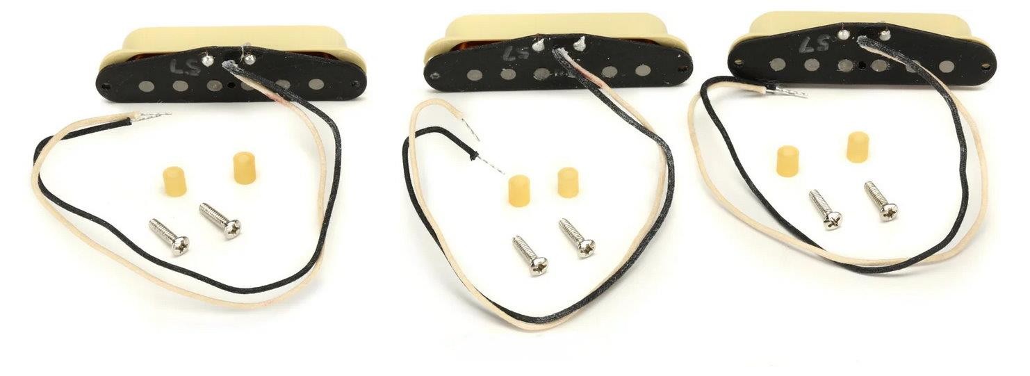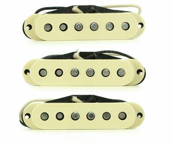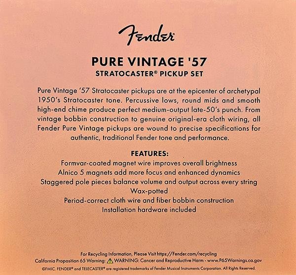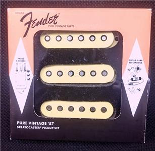 Open Box New Set Of Genuine Fender® Pure Vintage `57 Stratocaster Pickups (Bridge,Middle & Neck).Off White covers.Mounting hardware & wiring diagram included.Made in the USA. Output Vintage DC Resistance-B-M-N 6.1k To 6.4k ohms Inductance 2.47 henries Pure Vintage ’57 Stratocaster pickups are at the epicenter of archetypal 1950’s Stratocaster tone. Percussive lows, round mids and smooth high-end chime produce perfect medium-output late-50’s punch. From vintage bobbin construction to genuine original-era cloth wiring, all Fender Pure Vintage pickups are wound to precise specifications for authentic, traditional Fender tone and performance. Features Formvar-coated magnet wire improves overall brightness Alnico 5 magnets add more focus and enhanced dynamics Staggered pole pieces balance volume and output across every string Wax-potted Period-correct cloth wire and fiber bobbin construction Installation hardware included