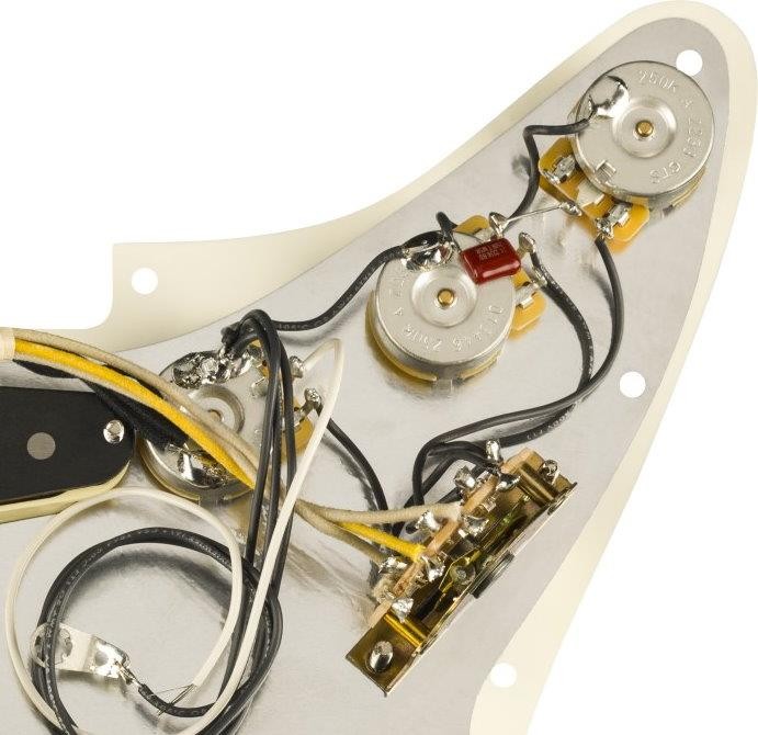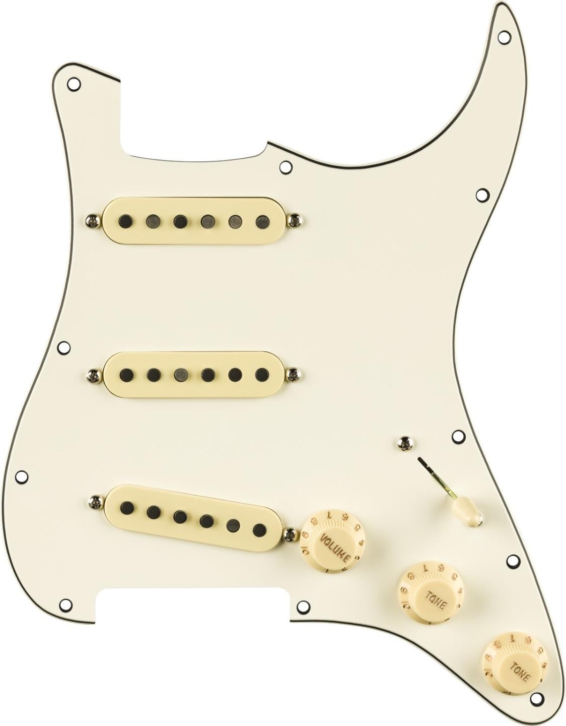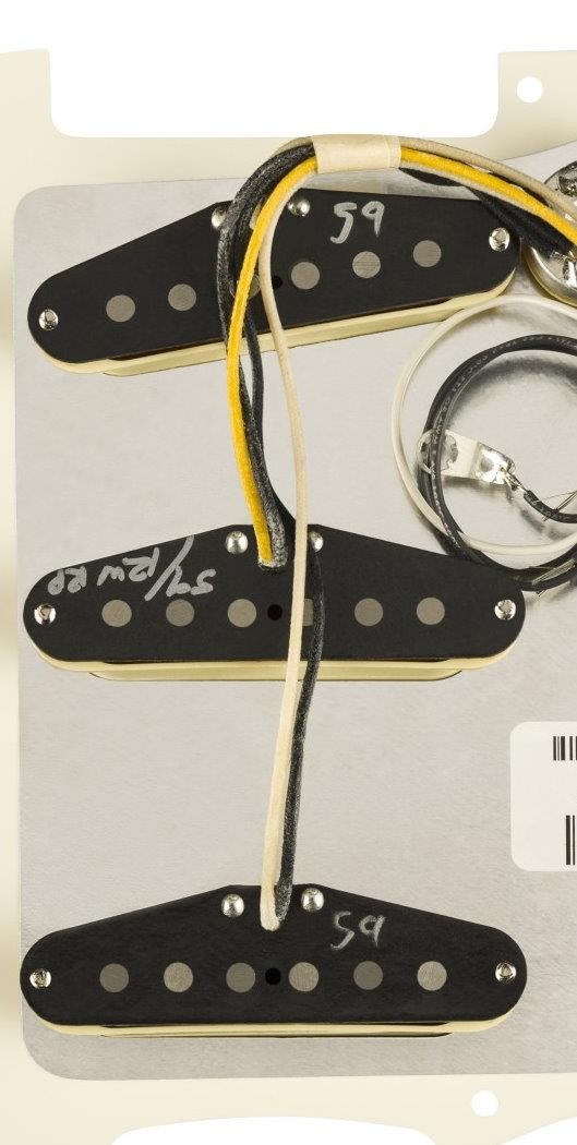 New Open Box ( Customer Return ) Genuine Fender® Factory Assembled Pure Vintage `59 Loaded Pickguard.RWRP Middle Pickup.Parchment Pickguard,Aged White Pickup Covers,Knobs & Switch Tip.Fender 250K CTS pots & Fender 5 way switch.Will Ship Fender Factory Boxed As Shown.From Fender: Built to evoke the original era of the Fender Stratocaster, these single-coil ’59 Strat pickups produce round, warm tone with a sweet edge. From vintage bobbin construction to genuine original-era cloth wiring, all Fender Pure Vintage pickups are wound to precise specifications for authentic, traditional Fender tone and performance. The addition of a reverse wound reverse polarity middle pickup eliminates 60-cycle hum in positions 2 and 4 and adds the classic Stratocaster quack to those positions. Formvar-coated magnet wire improves overall brightness Alnico 5 magnets add more focus and enhanced dynamics Staggered pole pieces balance volume and output across every string Wax-potted Reverse-wound middle pickup to eliminate hum.Features: Bridge PickupPure Vintage ’59 Single-Coil Strat® Middle PickupPure Vintage ’59 RWRP Single Coil Strat® Neck PickupPure Vintage ’59 Single-Coil Strat® Pickup ConfigurationSSS Lead WireCloth-covered Magnet TypeAlnico 5 Magnet WireFormvar-coated ShieldedYes Pole PiecesStaggered Bobbin MaterialFiber ControlsMaster Volume, Tone 1. (Neck Pickup), Tone 2. (Bridge/Middle Pickup) Switching5-Position Blade Switch OutputVintage DC Resistance5.8K Inductance2.6 Henries Power RequirementsPassive PotentiometersCTS 250K