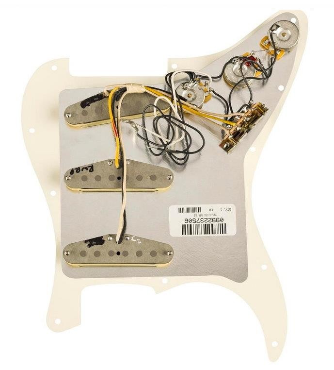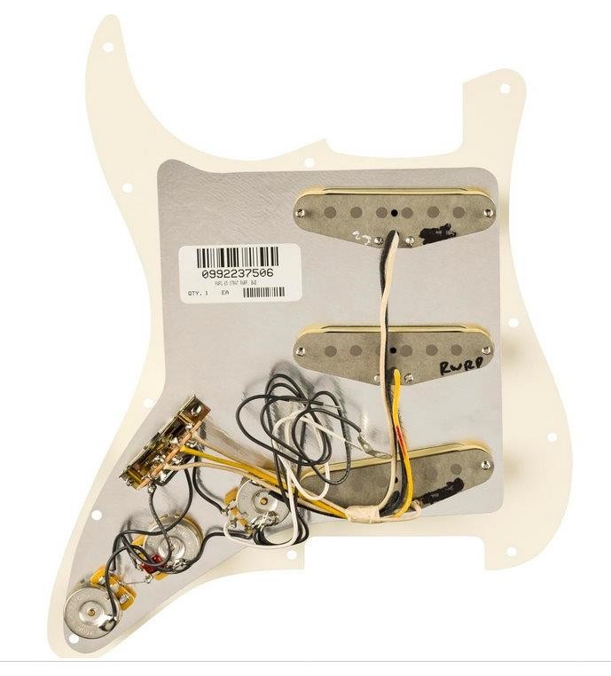 New Open Box ( Customer Return ) Genuine Fender® Factory Assembled Pure Vintage `65 Loaded Pickguard.RWRP Middle Pickup.Parchment Pickguard,Aged White Pickup Covers,Knobs & Switch Tip.Fender 250K CTS pots & Fender 5 way switch.Will Ship Fender Factory Boxed As Shown.From Fender: No other pickups give you the powerful, clean and clear surf rock tones of mid-’60s Stratocaster guitars like dutifully constructed, meaty-sounding Pure Vintage ’65 Strat pickups. From vintage bobbin construction to genuine original-era cloth wiring, all Fender Pure Vintage pickups are wound to precise specifications for authentic, traditional Fender tone and performance. The addition of a reverse wound reverse polarity middle pickup eliminates 60-cycle hum in positions 2 and 4 and adds the classic Stratocaster quack to those positions.Features: Formvar-coated magnet wire improves overall brightness Alnico 5 magnets add more focus and enhanced dynamics Staggered pole pieces balance volume and output across every string Wax-potted Reverse-wound middle pickup to eliminate hum