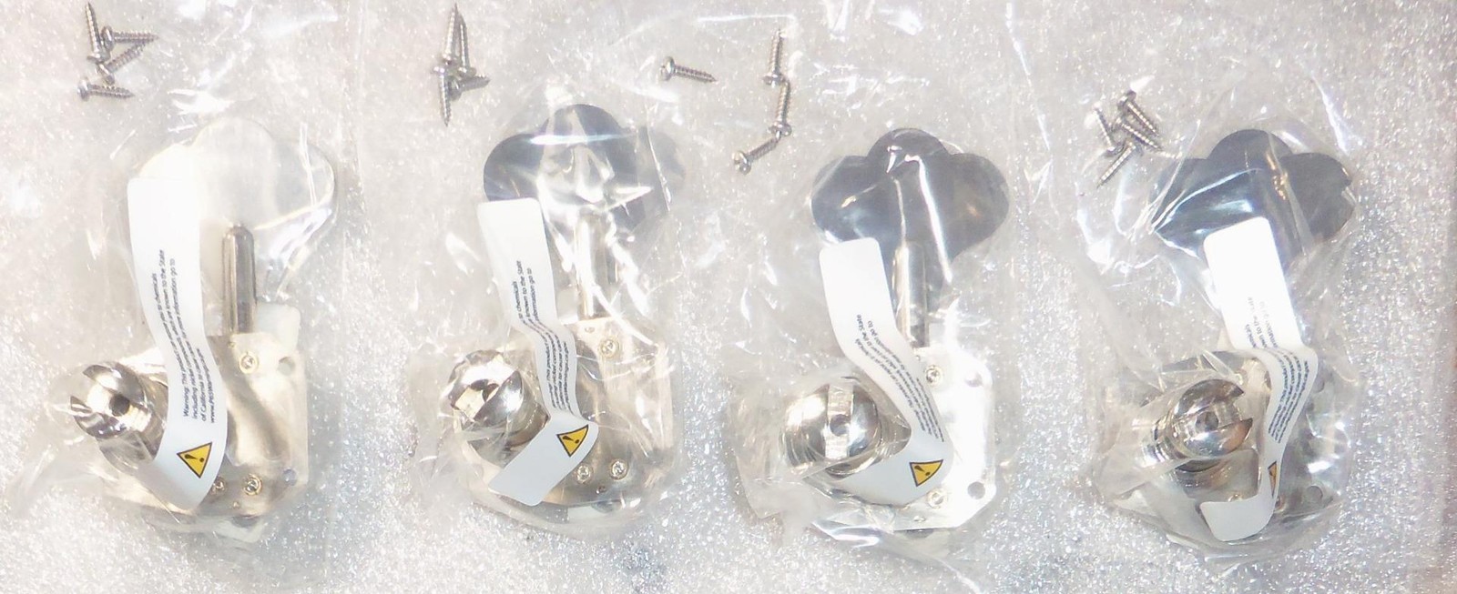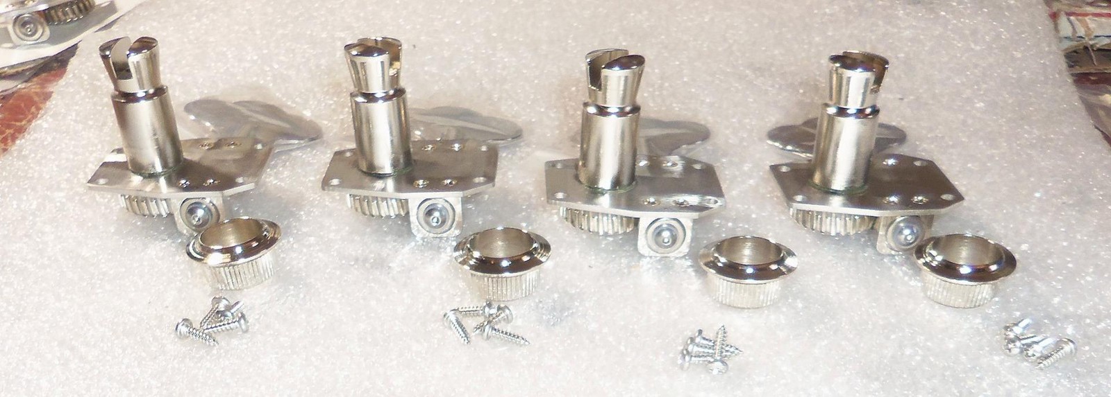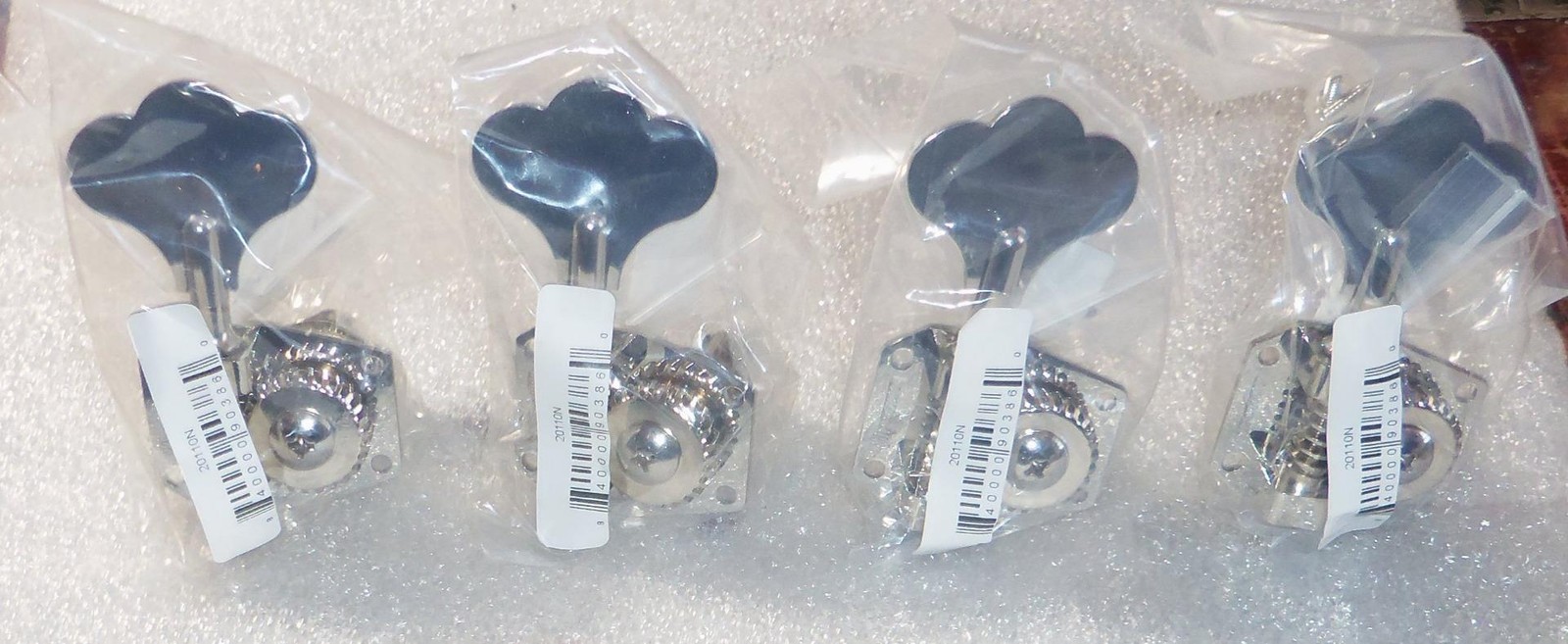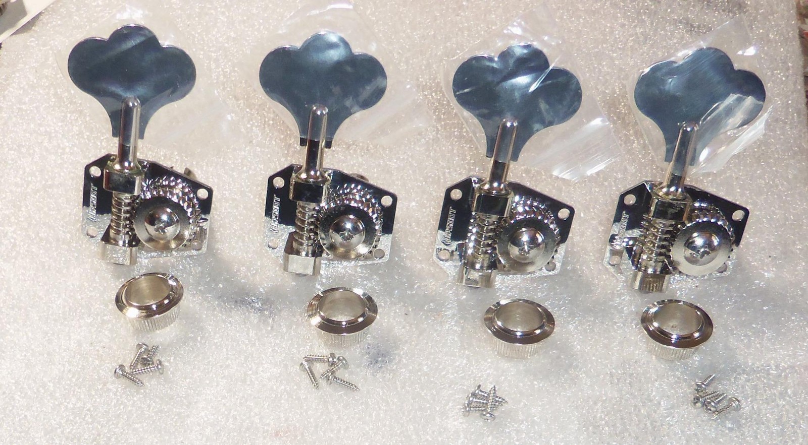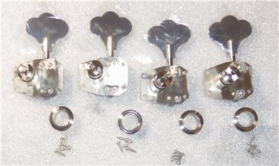 Brand New Hipshot HB1 American Classic Bass Tuner Set Of 4.Nickel Finish,Clover Keys,Standard Length Key With A Reversible Shaft For Right Handed Or Left Handed Players.Will Ship Individually Packaged As Pictured.Made In The USA. From Hipshot: The finest quality materials and precision engineering have been combined to make American Classics the best bass tuning machines you can buy. 27:1 ratio with adjustable gear lash tension. The HB1 fits most G&L®, Music Man®, and some Gibson® basses. Mounting hole spacing is 13/16″ across the top, 11/16″ across the bottom, and 1-3/8″ top to bottom(on center). Requires 11/16″(17.5mm) peghead holes. Includes bushings and mounting hardware. Replace those sloppy, worn out tuning machines with a set of Hipshot American Classics. The HB1 is a direct replacement for the Schaller® BM tuner traditionally featured on MusicMan® and G&L® basses. Many independent custom builders choose this tuner as well.