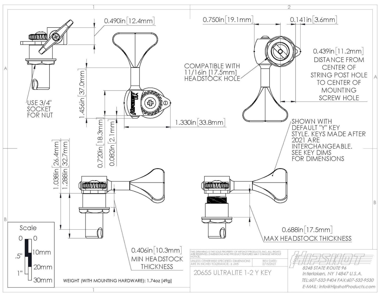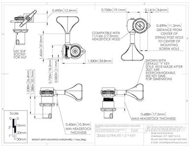 - 1/2″ string post fits 11/16″ [17.5mm] headstock holes.