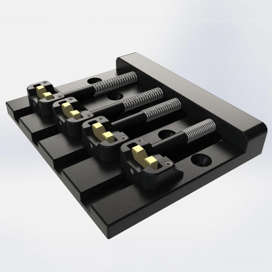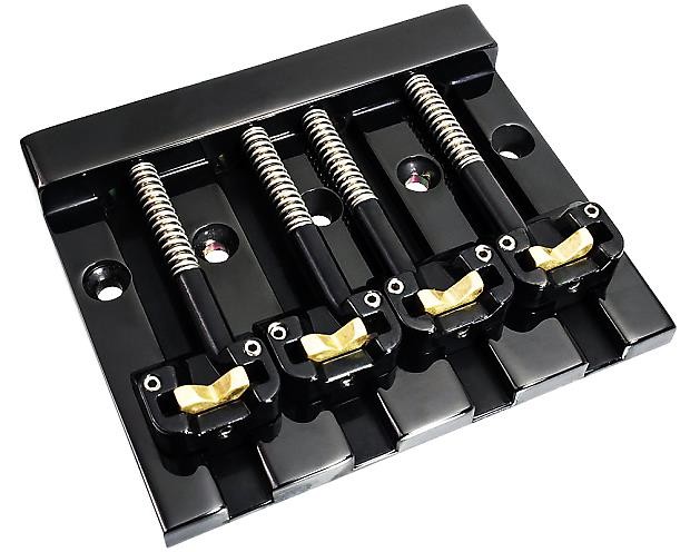 Brand New Hipshot KickAss 4 String Black Bass Bridge.This bridge retrofits the Badass Bass Bridge.Will ship factory boxed as shown.From Hipshot: Hipshot is proud to offer the KickAss Bass Bridge. Hipshot spent years plus countless versions ensuring that this ‘tribute’ would possess the soul of the original without being a copy. The KickAss features the following. The unique saddle design features pre notched inserts (no filling required). These inserts allow you to easily adjust your string spacing from a narrow .687″ (17.5mm) to a wide .800″ (20mm) and anywhere in between! The KickAss comes standard with brass saddle inserts which emphasize the fundamental tone and give your bass a mellow sound. Optional Stainless-steel inserts can be purchased separately. The KickAss mounts on a typical 5 hole bass configuration and features recessed string ball holes for a sleeker look.