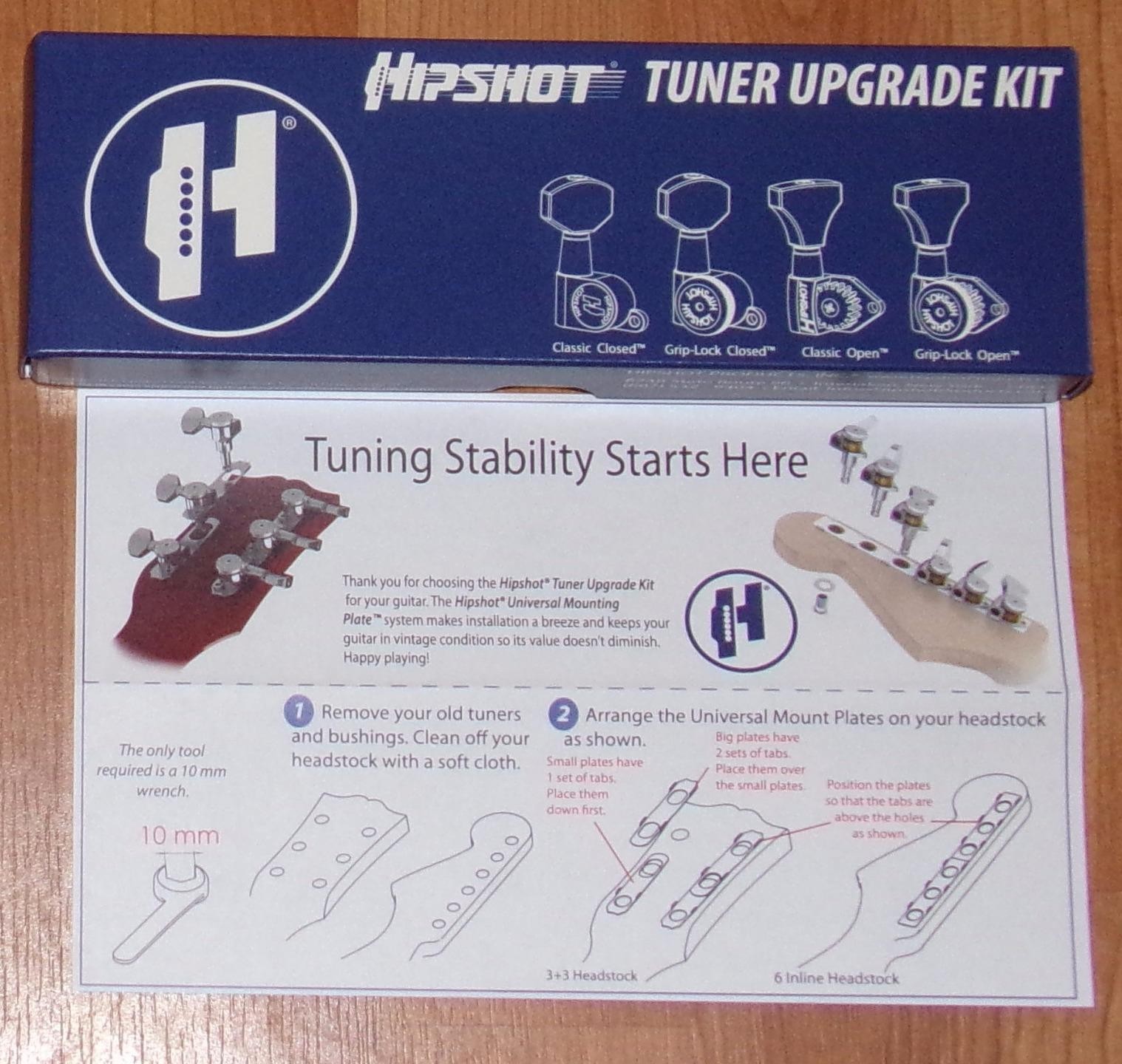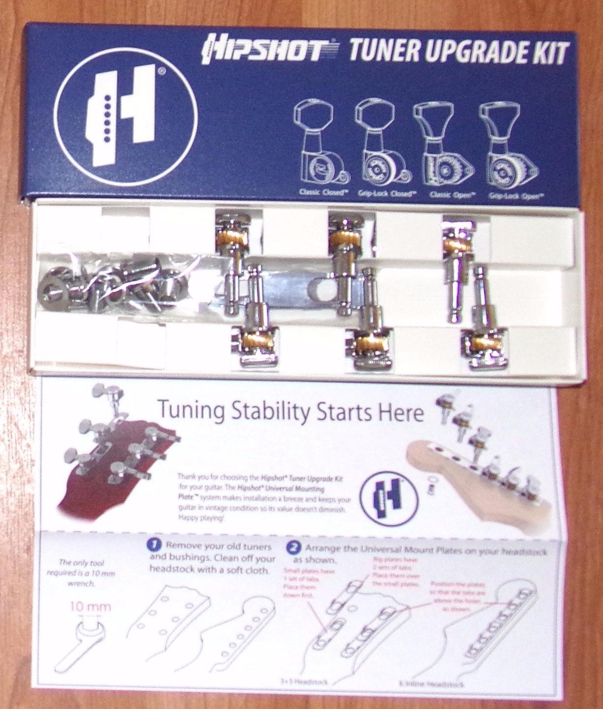 Upgrade your tuners and improve the tuning accuracy and stability of your 3 + 3 headstock guitar with Hipshot’s Tuner Upgrade Kit. With the patent pending UMP™(Universal Mount Plate) included free in this kit, tuners will install without drilling or screwing your headstock . Upgrading your guitar’s tuners is only slightly less of a hassle than dealing with the old, worn out, inaccurate or broken tuners you have now.Finding the right aftermarket tuners that match up with your guitar’s mounting hole pattern can be a guessing game and if your new tuners don’t match, you’re stuck drilling new holes, filling the old holes and screwing in the new tuners.