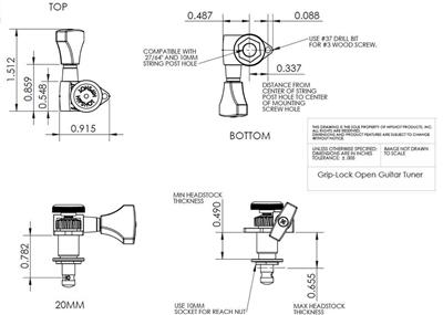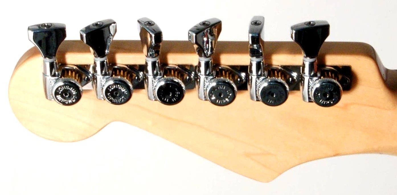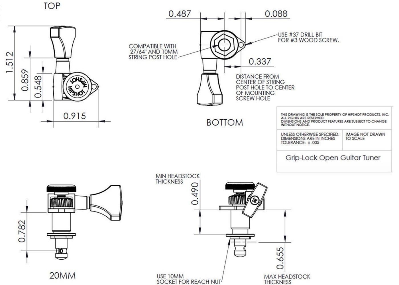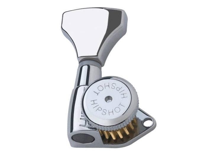 Brand New Genuine Hipshot Nickel,Open Gear 6 Inline Locking Tuner Set With UMP Upgrade Kit.Non-Staggered.Requires 10mm Peg Holes.Measure Your Peg/Post Holes Before Purchasing.Will ship Hipshot factory boxed as shown.GRIP-LOCK locking guitar tuners possess the precision, craftsmanship and technology you have come to expect from Hipshot Products. Instead of your old, time consuming string changing ritual, simply pull the string through the hole and tighten the thumbwheel. A small pin inside the string post will grip your string and lock it in place for worry free tuning!Grip-Lock pin and thumb wheel system clamps onto your string for extra security